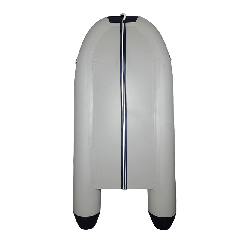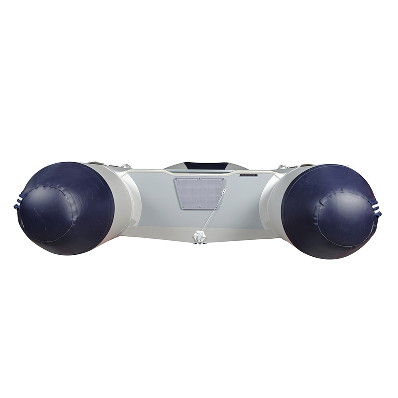 Il présente un schéma de couleurs gris foncé et bleu foncé. Une bande d’abrasion blanche de 8 cm de large avec des rainures étanches autour de la coque et une bande d’abrasion blanche de 7 cm de large au fond protègent efficacement la coque. Le fond utilise des plaques en alliage d’aluminium, améliorant la stabilité et la rigidité de la coque. Bien que les flotteurs soient gonflables, le fond robuste permet tout de même à toute la coque de très bien fonctionner dans l’eau.