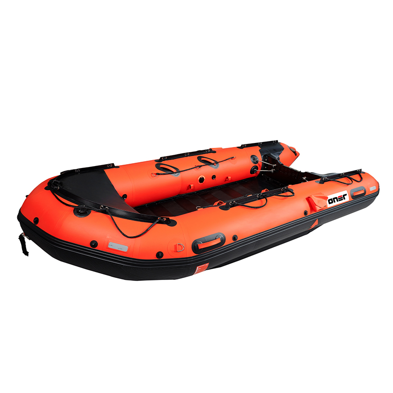 Le bateau de sauvetage ONER est utilisé dans les opérations de sauvetage aquatique chinoises depuis plus de six ans. Son design unique et son savoir-faire exquis sont très appréciés par les sauveteurs, ce qui lui confère une position indispensable dans le domaine du sauvetage aquatique chinois. L'ajout de tubes rapides au fond du bateau améliorera encore sa stabilité et sa vitesse. Équipé de notre valve et de nos cylindres à gonflage rapide uniques, le temps de gonflage sera considérablement réduit, ce qui fera que chaque seconde compte réellement pour sauver des vies. Nous avons également développé une plaque arrière remplaçable ; si votre plaque arrière en bois est fortement corrodée par l'eau, vous pouvez facilement la retirer et la remplacer par une nouvelle, économisant ainsi le coût de remplacement de la coque entière.